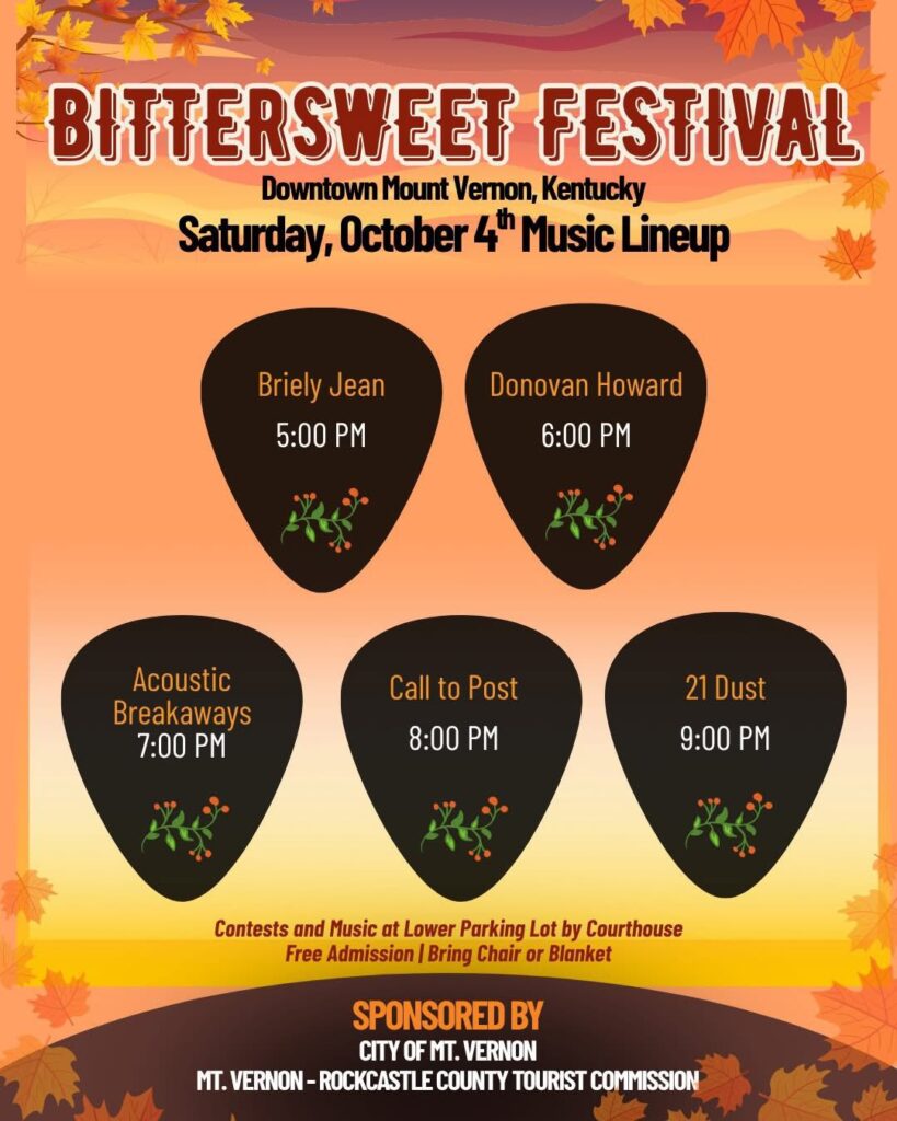 Join us for the 2025 Bittersweet Festival on Main Street in downtown Mt. Vernon, Kentucky on October 2-4th. It is FREE to attend with fun activities such as car show, inflatables, parade, contests, craft vendors, live music, plane kiddie rides, razzmatazz ballistic swings, games, and more. Presented by the City of Mount Vernon and Mount Vernon – Rockcastle County Tourist Commission. Craft Vendor signups must contact City Hall at 606-256-3437 to register by September 25, 2025.